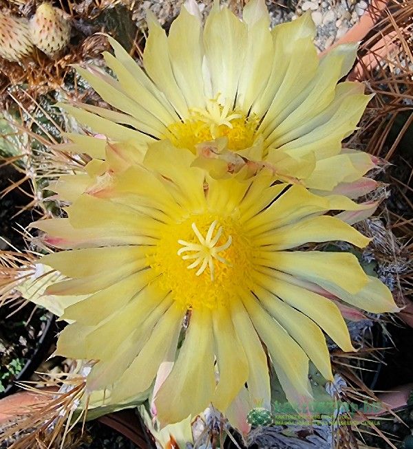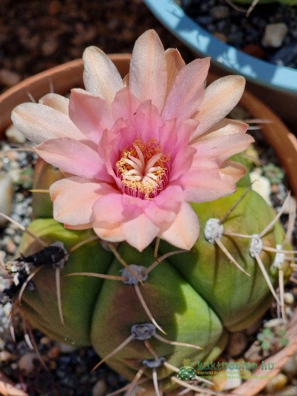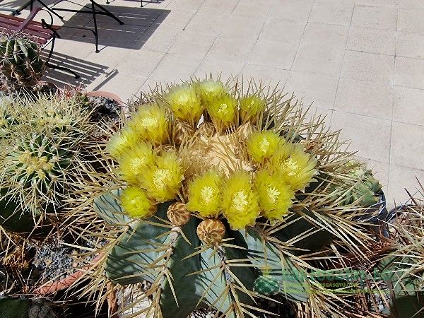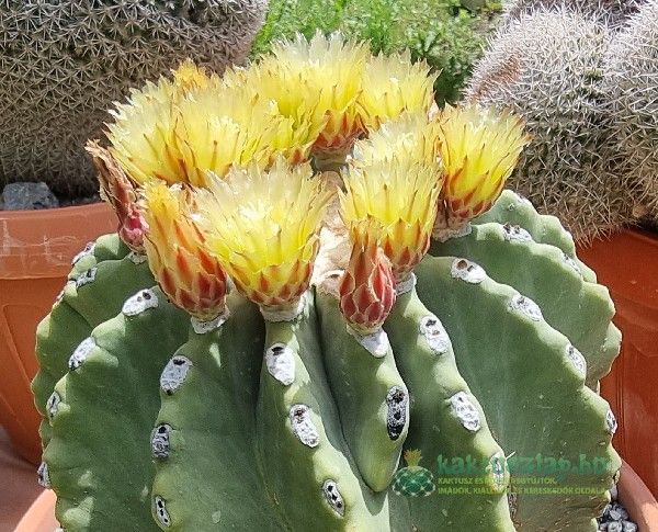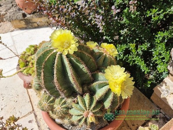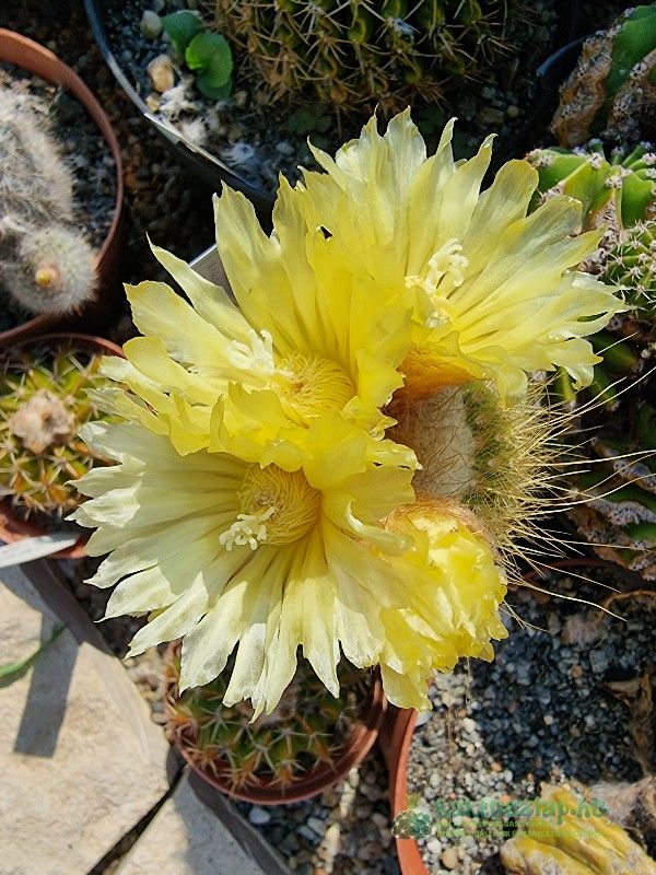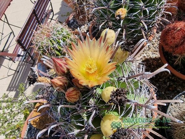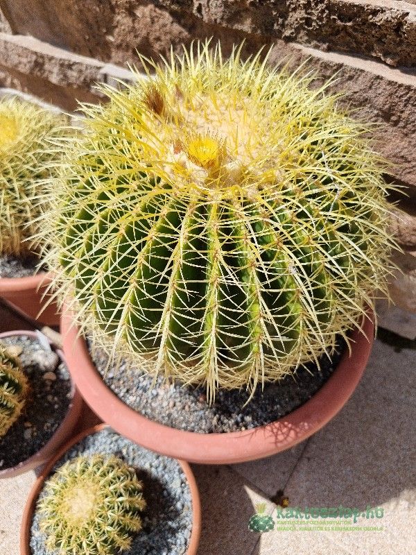 Azonban volt olyan is, amelyik 2024-ben virágzott először. Ez pedig egy Echinocactus grusonii. Ami igazán különleges alkalom, hiszen a grusonii-nak 25-30 éves koruk után várható az első virágzásuk. A legnagyobb E. grusonii-at nagyon régen vettem, s akkor nagyjából öklömnyi volt, vagyis úgy 5-10 év körüli lehetett.