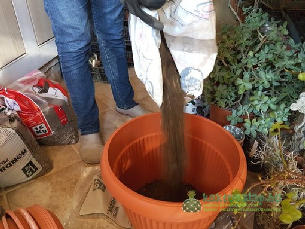Első lépésben előkészítettem az eszközöket, előszedtem a saját keverésű földet. Az új cserepet félig megtöltöttem a földdel.