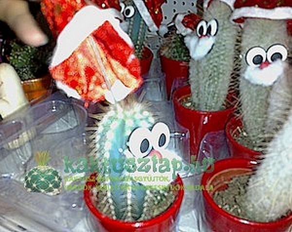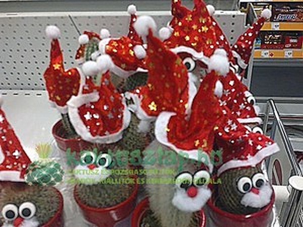 Hiszen ezúttal nemcsak ráragasztották a szemeket és szakállacskát a kaktuszokra, ahogy a szalmavirágokat szokták, hanem Mikulás-sapkát is biggyesztettek a tetejükre.