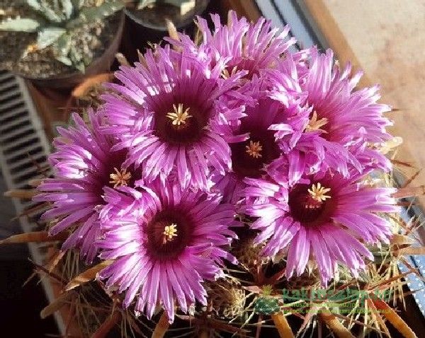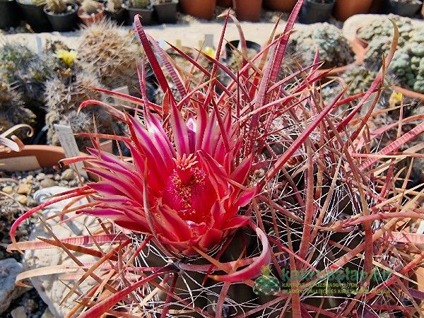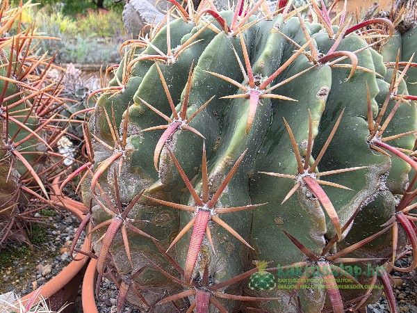 - Ferocactus latispinus: Lapos, széles, kampós tövisek; gyakori gyűjtői faj, szép lilás virágokkal. Első virágzás 5–8 évesen. Virágának a színe lila-rózsaszín.