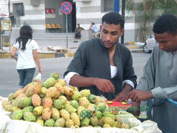 Az árusok néhány egyiptomi fontért (1 euró 7 egyiptomi font volt akkor) adtak egy zacskónyit. S persze mint mindenhol Egyiptomban (még a patikában is!!) alkudni lehetett – sőt illett – az árból. Azért azt meg kell említsem, hogy nemcsak megmosták a kaktuszgyümölcsöket – igaz egy flakonból, és kétes tisztaságú vízzel -, hanem ott helyben meg is pucolták a kliensnek, majd pedig nejlonzacskóba tették.
