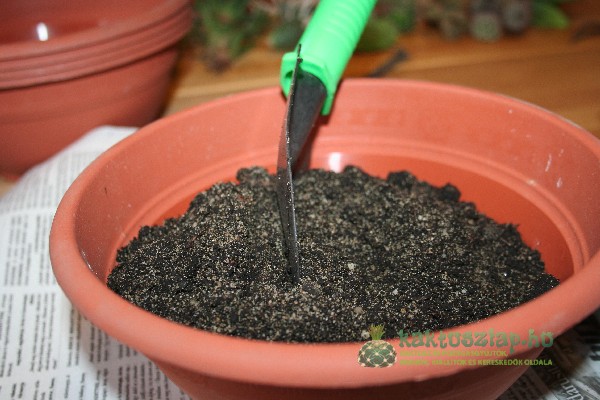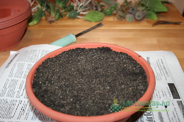 A cserépbe kaktuszföld-keveréket töltöttem, amelyet magam készítettem: fele-fele arányban kevertem össze homokot/sódert és általános virágföldet.