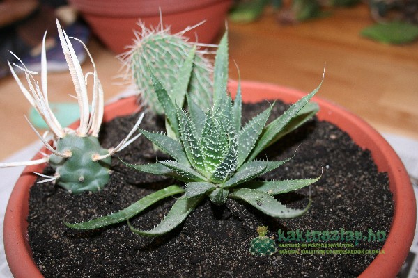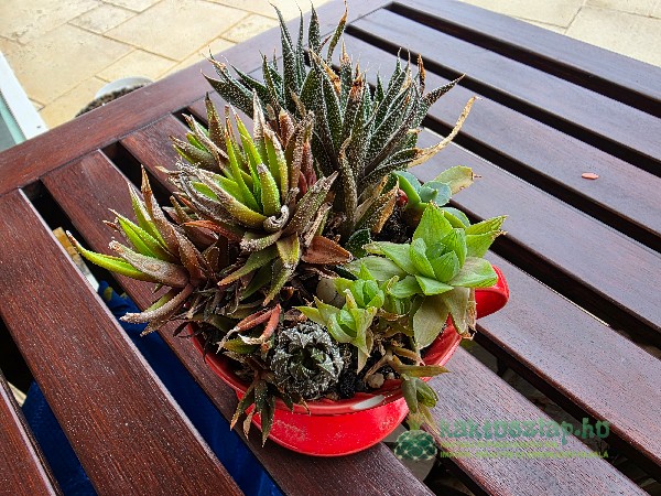 Ebbe is kompozíció került. Ezúttal egy kicsit kompaktabb lett, s elsősorban Haworthiák kerültem egyben. Ezeknek teljesen azonos a gondozása. Ablakpárkány növényeknek is hívom, mert kimondottan szeretik a fény, de a tűző napot nem tolerálják. Locsolni pedig akárcsak a többi pozsgást, télen alig, nyáron kicsit gyakrabban kell.