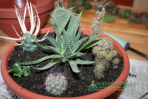 A kompozíciómba Opuntia- (fügekaktusz-) és Mammillaria-fajok sarjait válogattam, kiegészítve két pozsgással: egy Crassula ovata (pozsgafa) különlegességgel és egy Aloe fajtával. Bár utóbbi pozsgás kissé érzékenyebb a tűző napsütésre, vízigénye jól illeszkedik a kaktuszokéhoz.