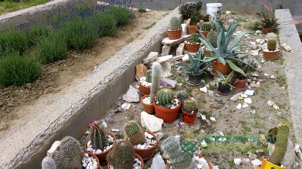 Kaktuszainkból úgy is kialakíthatunk egy kis szigetet, hogy nem ültetjük közvetlenül a földbe, hanem saját cserepüket süllyesszük be. Így ősszel könnyebb összeszedni majd.