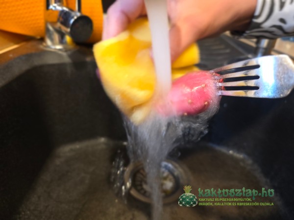 2. Tisztítás. A gyümölcsöt mossuk át folyó vízzel, majd pedig egy tiszta szivaccsal dörzsöljük jól át. (Természetesen ez a szivacs másra már nem használható, hiszen tele lesz apró tövisekkel, mindenképp el kell dobni!)