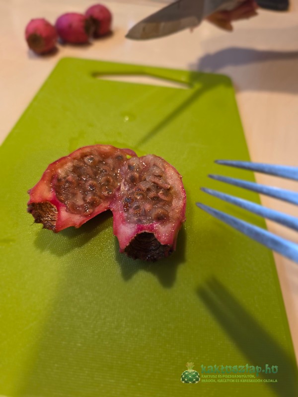 Ezúttal nem vásárolt, hanem saját terméssel mutatom be, hogyan is kell nekilátni a kaktuszgyümölcsnek. A sziklakertemben több Opuntia phaeacantha is nevelkedik, egyik hibrid termését kóstoltam meg.